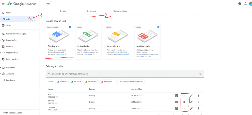 AdSense dashboard open karne ke baad Home pe click karo, fir “My Ads” wale section mein jao aur “Ad Units” pe click karo. Phir aapko “Create Ad Unit” ka option milega – uspe click karna hai.