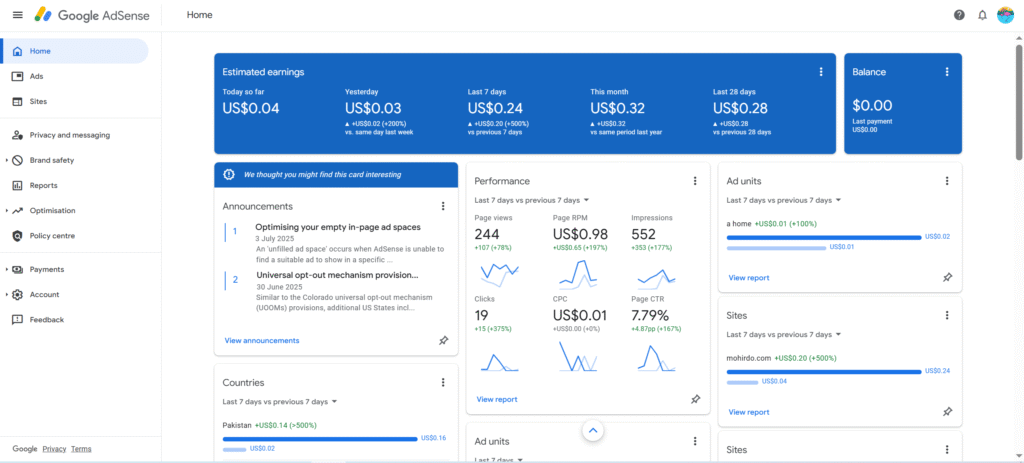 Ab wapas dashboard mein aake “View my AdSense for earning details” pe click karo. Ye aapko aapke AdSense account ke dashboard par le jaayega. Agar aapne Blogger ke through AdSense ka account nahi banaya to seedha adsense.com pe jaake login karo.